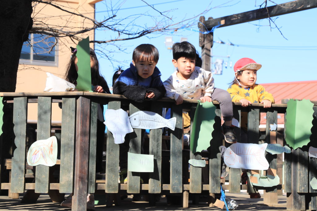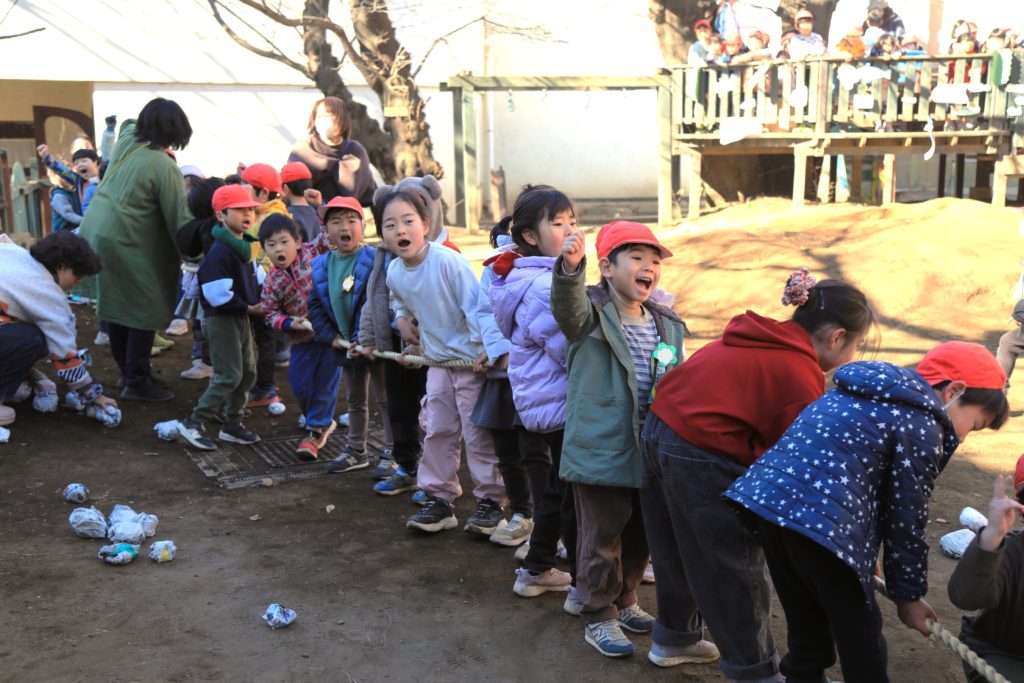 鬼が怖くて涙する子もいれば、鬼に挑んで新聞紙お豆を投げて戦う子も。最後は鬼vs子どもたちで綱引き対決! 力一杯戦って、鬼に勝つことができました。